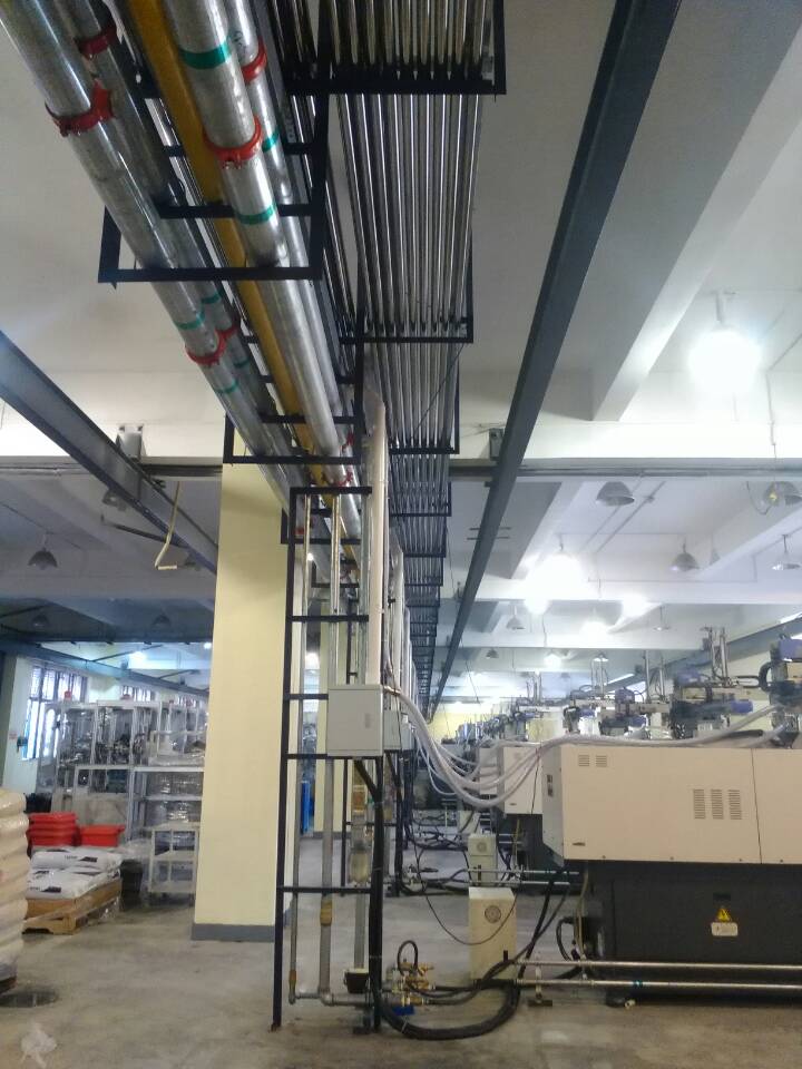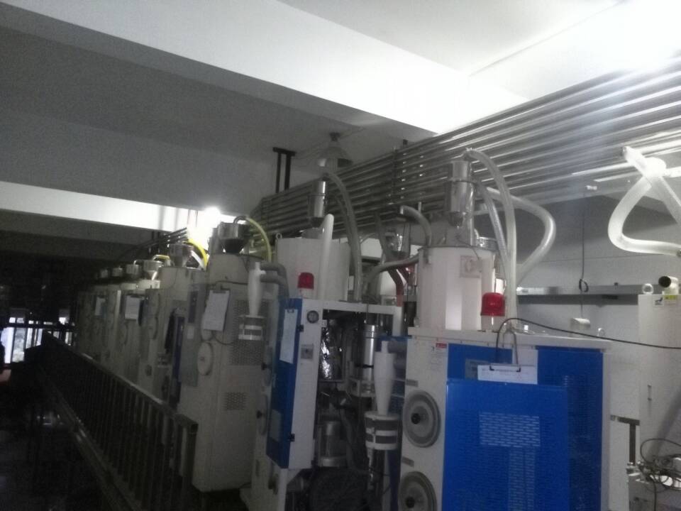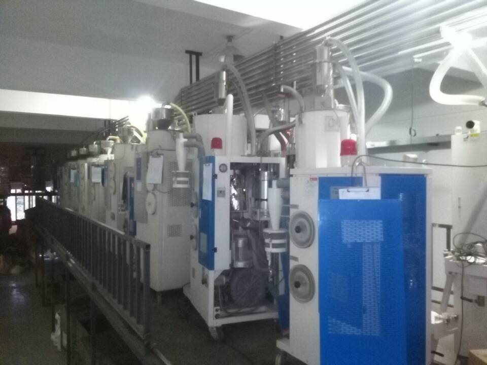 塑料中央供料系統(tǒng)采用真空傳送方式,通過集中的管路系統(tǒng)將塑料原料從儲料罐輸送到中央除濕干燥系統(tǒng),然后將干燥后的原料輸送到每臺注塑機(jī)中。烘干上料輸送系統(tǒng)采用“一臺機(jī)器一根管”的設(shè)計(jì)方式,烘干上料系統(tǒng)保證整個系統(tǒng)的空氣對原料進(jìn)行輸送,防止除濕干燥后的原料回潮。同時在每個輸運(yùn)行穩(wěn)定,絕無堵料的現(xiàn)象發(fā)生。