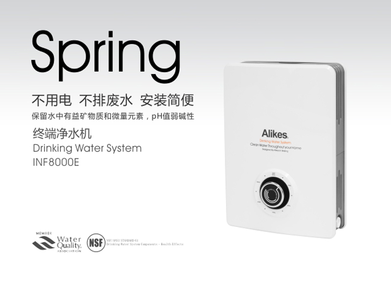 Alikes INF8000E凈水機,采用國際流行的雙芯過濾的101水道平臺,食品級高強材料成型,完善的人機工程學設(shè)計。采用大顯示的刻度盤以及阻尼適度的流量旋鈕。使用Alikes通水切換開關(guān),同樣的******設(shè)計與凈水機配合相得益彰。去除水中的泥沙鐵銹,微生物、******,有害重金屬,游離余氯。同時改善了水的口味。飲用起來更清冽甘甜。
